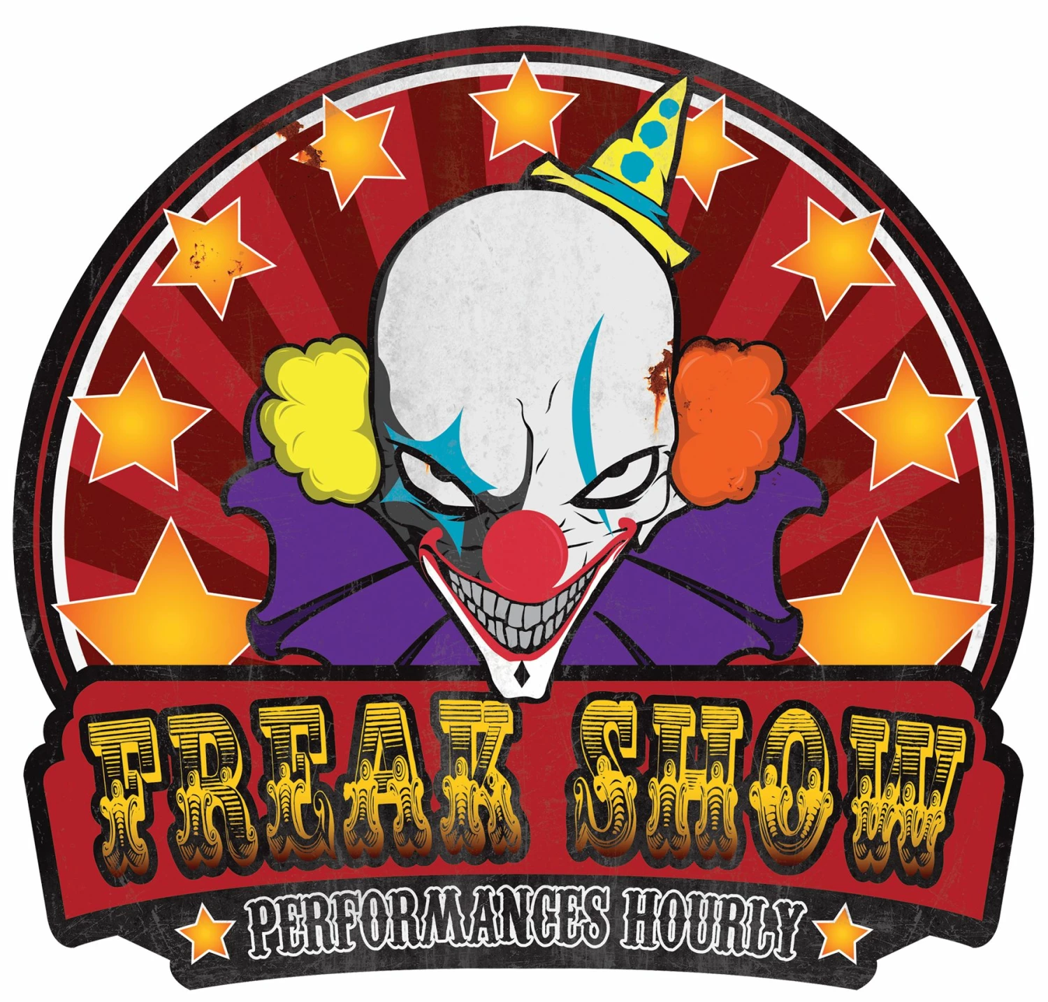 A great sign for your haunted house home haunt display or even a great Halloween party! Sign shows demented looking clown on colorful background and says inchesFreak Show – Performances Hourly. Approximately 21.5 inches long and 23 inches wide.