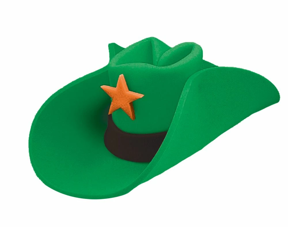 Foam rubber 40 gallon size hat with contrasting star and band. One size fits most. Brim measures 7 1/2 inches front and 1/2 inch side. Height 11 inches. Hat will need steaming and shaping to look its best.