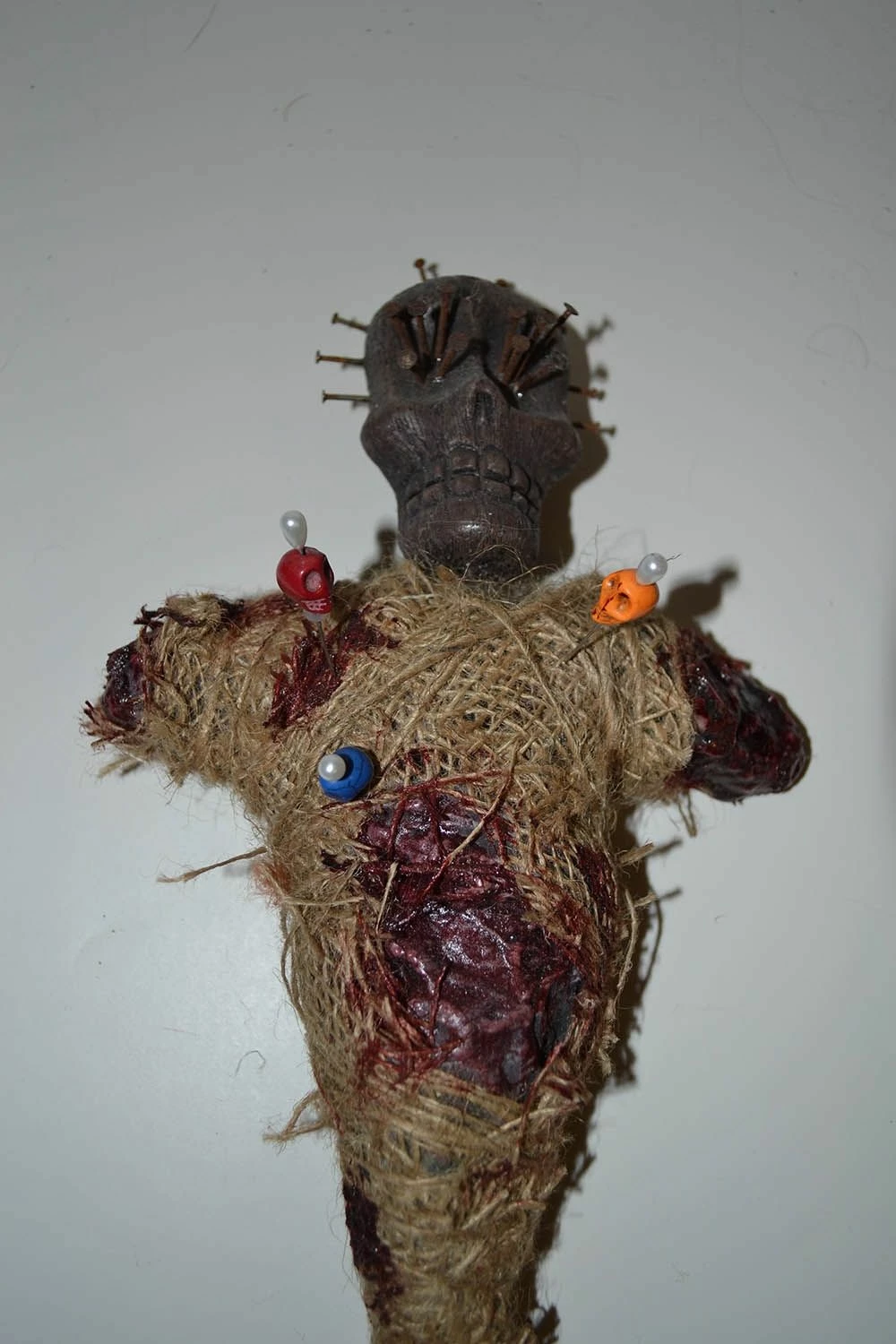 durable voodoo doll made out of resin, latex, foam and burlap.