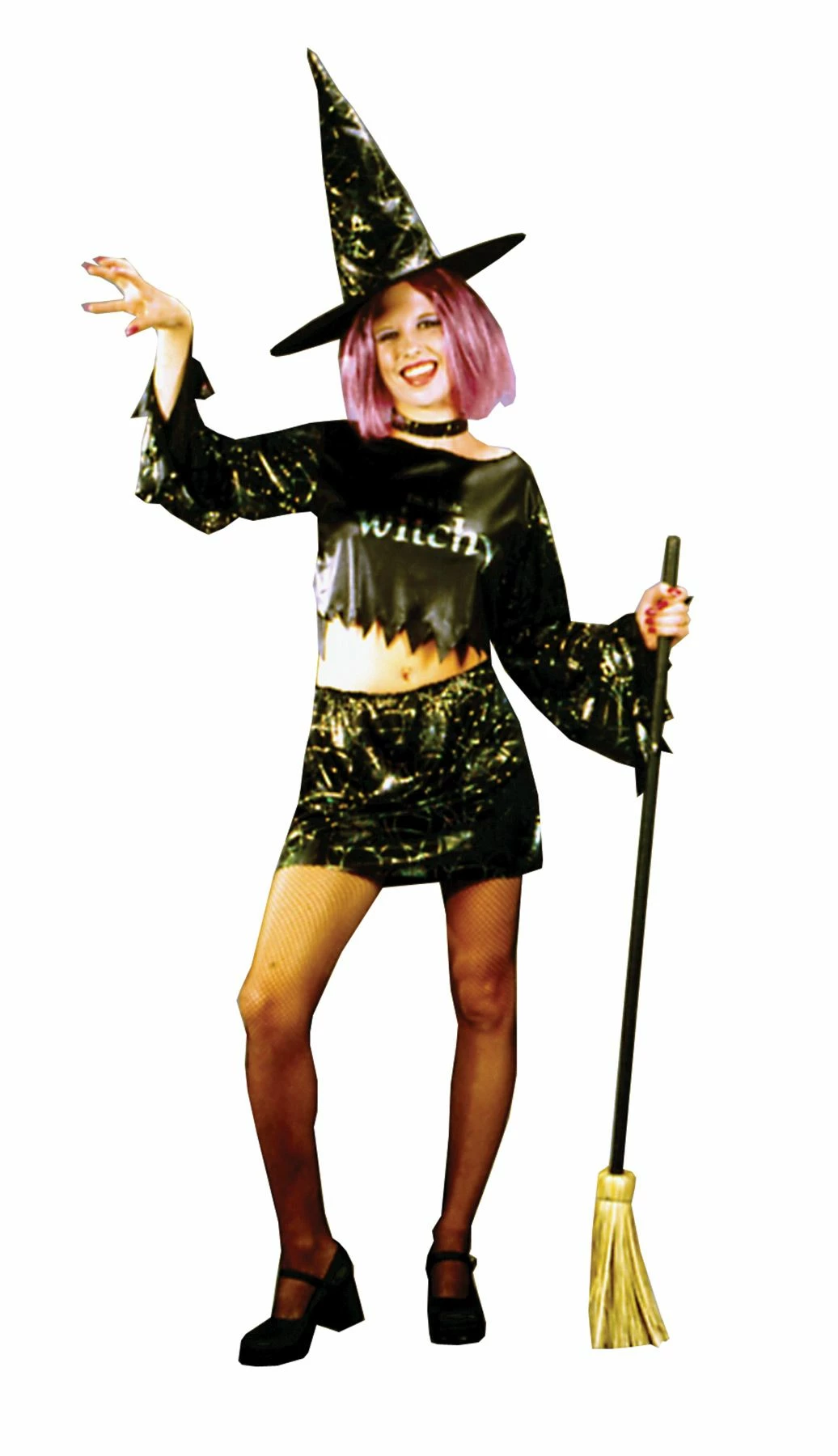 This witchy woman will be the hit at your next party! Iridescent foil stamp spider-web pattern mini-skirt, midriff top, choker, and witch hat. One size Teen 0-9.