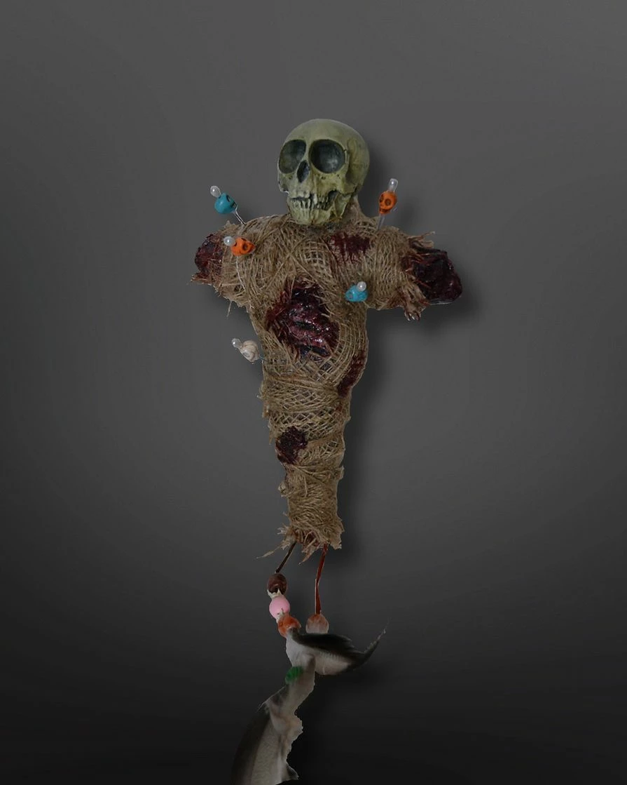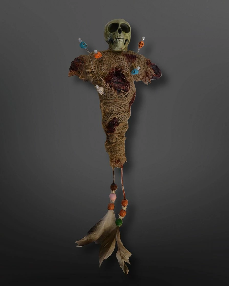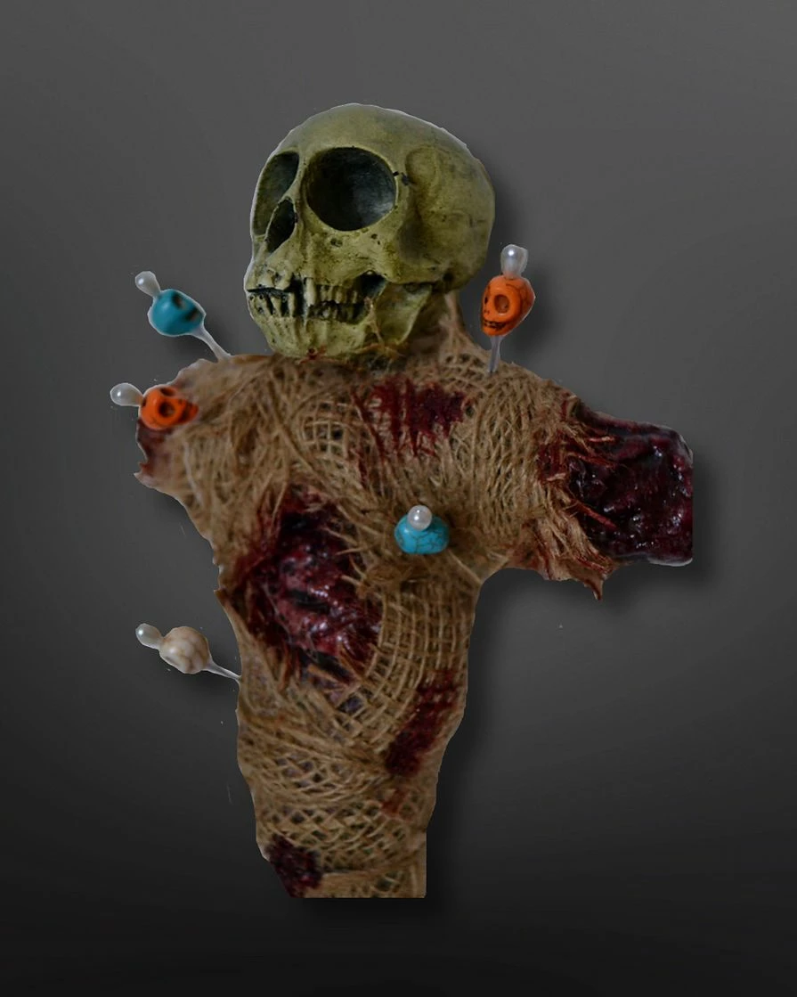 durable voodoo doll made out of resin, latex, foam and burlap. comes with three pins that can be stuck anywhere on the body.blood free verison also available- specifiy when ordering if you’d prefer one without blood.