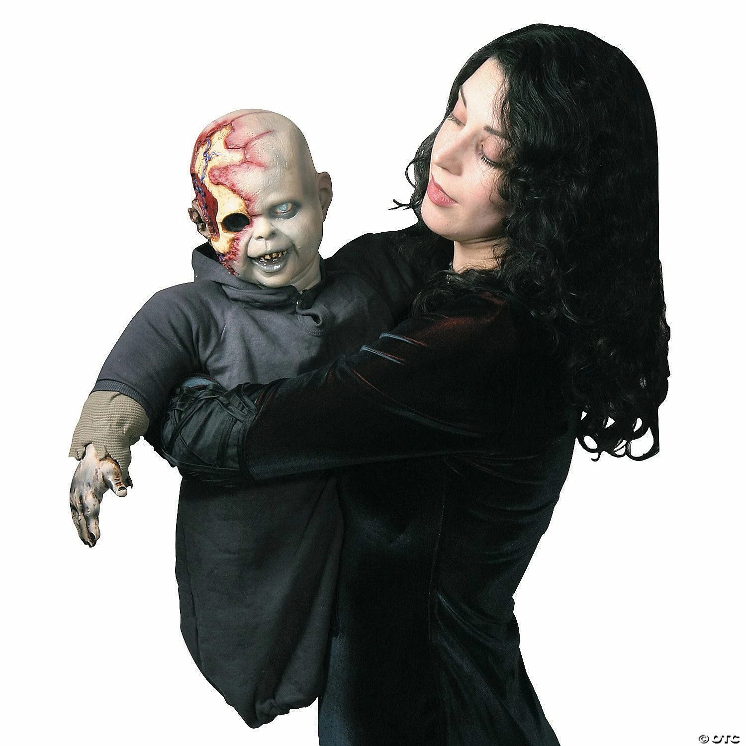The cutest little zombie youve ever seen! This zombie baby is actually a puppet you control his head and mouth through an opening in the back of his neck. Latex head and hands with a cloth torso. Head does not turn.